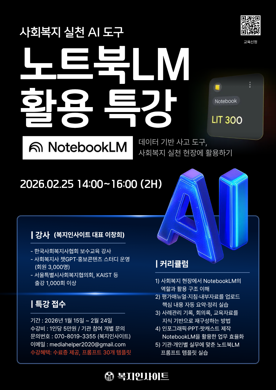 2026년 복지인사이트 첫 전문교육으로, 데이터 기반 사고 도구 NotebookLM(구글AI)을 중심으로 한 실무 특강을 준비했습니다.